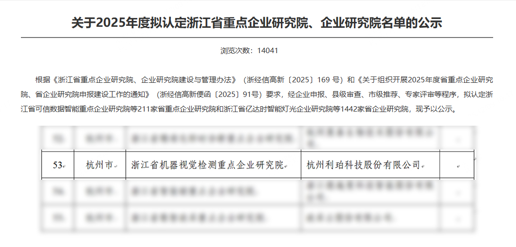 浙江省經濟和信息化廳發(fā)布2025年度省級企業(yè)研究院認定名單,利珀科技申報的“浙江省機器視覺檢測重點企業(yè)研究院”成功入圍,被認定為“浙江省重點企業(yè)研究院”。